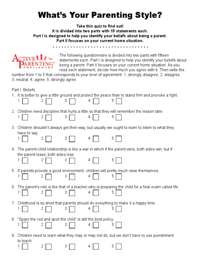 The following questionnaire is divided into two parts with fifteen statements each. 09.04.2019 · taking a parenting style quiz is a quick and easy way to identify who you are as a parent. Medically reviewed by timothy j. What is the parent's job? At the end of each section, add up your scores and divide the total by the number of questions in that section to find your calculated score for that category.